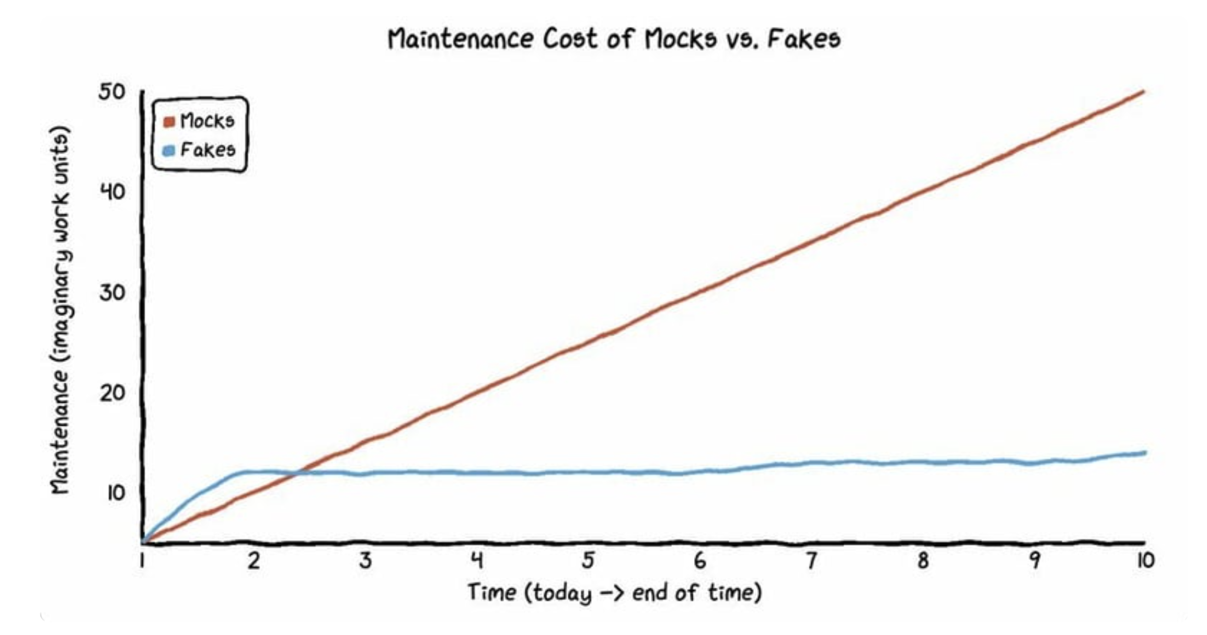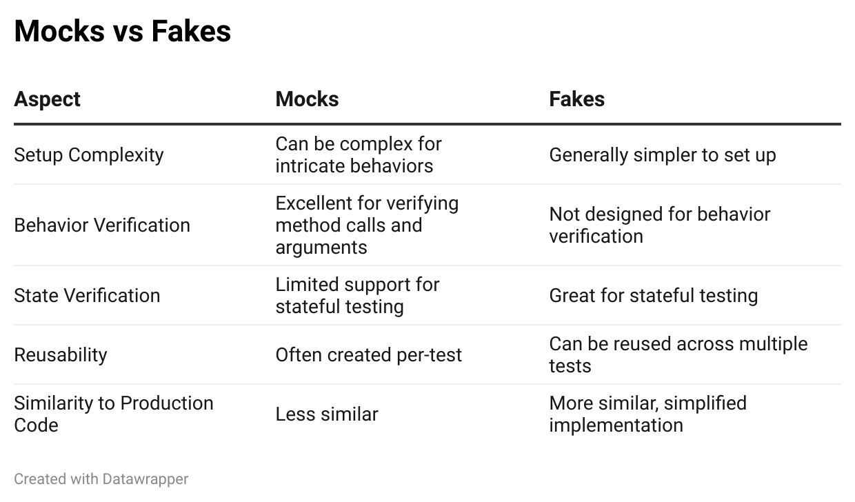 - Opt for fakes when you need to maintain state, test complex logic, or write tests that are closer to integration tests.
